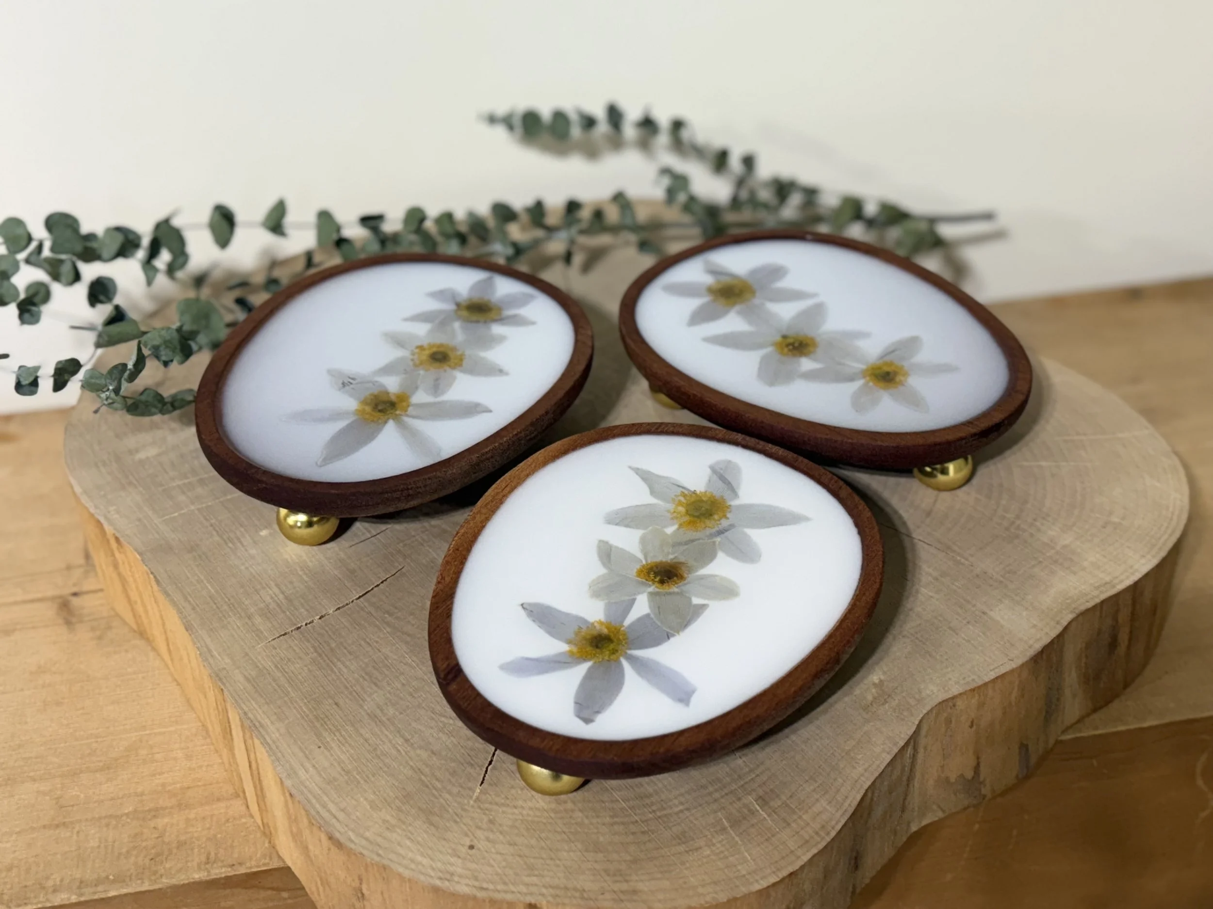 Flowers are carefully dried or pressed using specialized methods to maintain color and form.